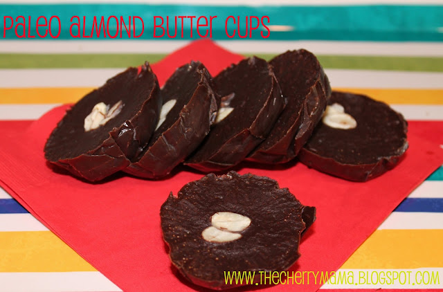 After adding your almond butter put back in the fridge while you make up another batch of chocolate. (I only say this because its 90 degrees outside things were getting a bit oily.) Whip those puppies back out and pour your chocolate. Optional add almonds to the top. Toss back in the fridge. Should set in about 30 minutes. I so a little prod test if I am getting a bit 'ancy in the pancies'.