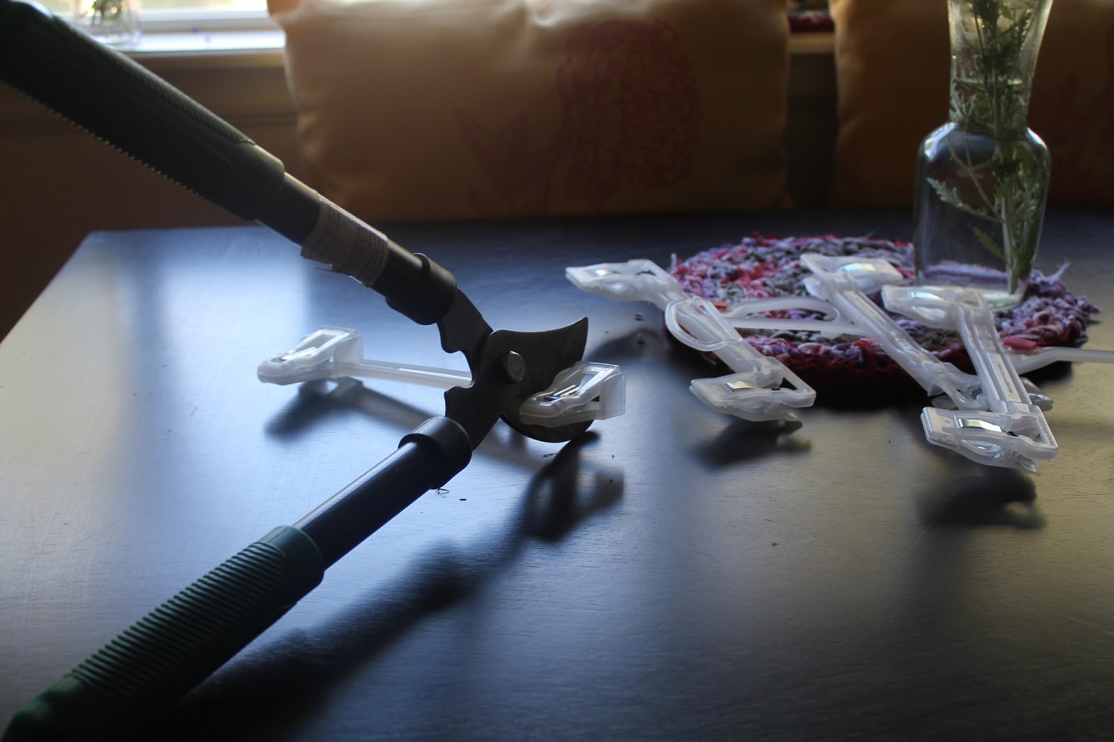 Got cheap plastic pant hangers around the house? Got some garden shears or strong scissors (like über strong)? Make lot's and lot's of bag clips! They work for chips, bags inside of boxes, and even in the freezer for those runaway frozen veggies.