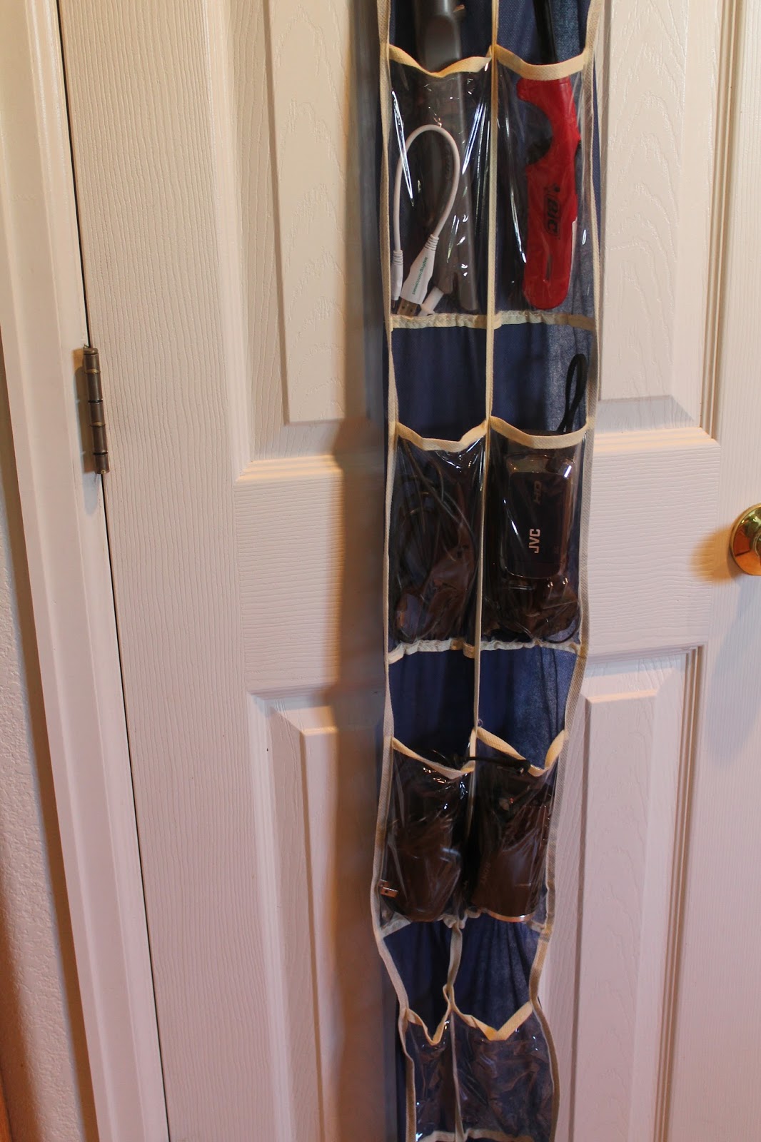 Too many chargers, USB cables, cameras, camcorders, and everyday 'wot-not'? I love these Dollar Store shoe organizers. They sure don't fit shoes, but its great on the back of the kitchen door in the hub of all the action. I am able to grab a camcorder, or a quick point and shoot. Then know where the cable is when it's time to transfer. It keeps everything from being a tangled mess. Since I live in the kitchen I keep and extra mouse in there for my laptop too. I will always know where all my tech stuff is.