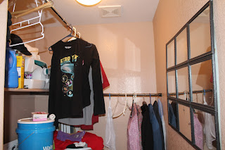 Tension rods, and shower curtain rods, I have many after the move, and I am glad that I kept them. My 1/2 bath is 1/2 laundry room; also the guest bathroom, and where my little pup pups sleep. All this in one small room. A quick fix was actually dividing the room. I don't need guest staring at my laundry area, so a tension rod and a left over curtain panel was a great fix. Recognize it? It's the third panel from this home refresh. You can also tell I am into my red's, yellows and clashing. Its also where I put some fun art pieces from the kids. But behind the curtain is where the laundry magic happens. Two shower curtain rods gave me room to hang right out of the dryer. It cuts down on how much I have to steam/iron when I am able to hang immediately. Before I had no room and it was a disaster pile. I hung my old Copy Cat mirror project in there because one of the mirrors bit the dust when I took it down to dust. You know what they say about adding mirrors to a room to make it feel bigger... does not work in this case. I tried.
